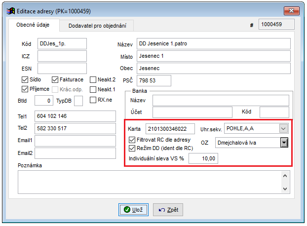 Parametry se nastavují v dialogu pro editaci adresy pro stisku F9 a F6 v číselníku odběratelů (v menu Číselníky volba Odběratelé a ostatní subjekty).