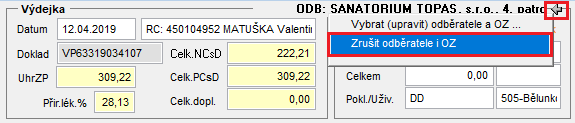 Provedení: Vyjmutí expedice se provádí v agendě Výdejky přes pokladnu v agendě Výdej zboží poklepáním na ikonu šipky a volbou Zrušit odběratele i OZ v zobrazeném menu.