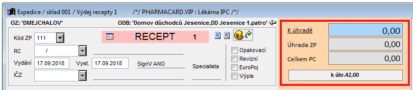 Pokud je nastaven režim výdeje DD pak je oblast se sumárními údaji o úhradě a doplatku zbarvena oranžově.