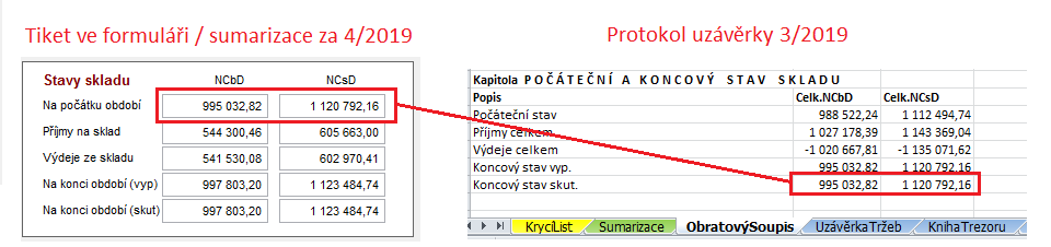 Kontrola se provádí mezi sumárními čísly za uzavírané období zobrazenými v dialogu Měsíční uzávěrka období a protokolem uzávěrky (karta Obratový soupis) za předchozí období.
