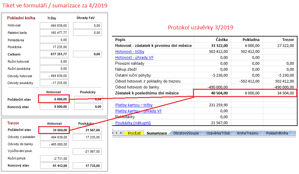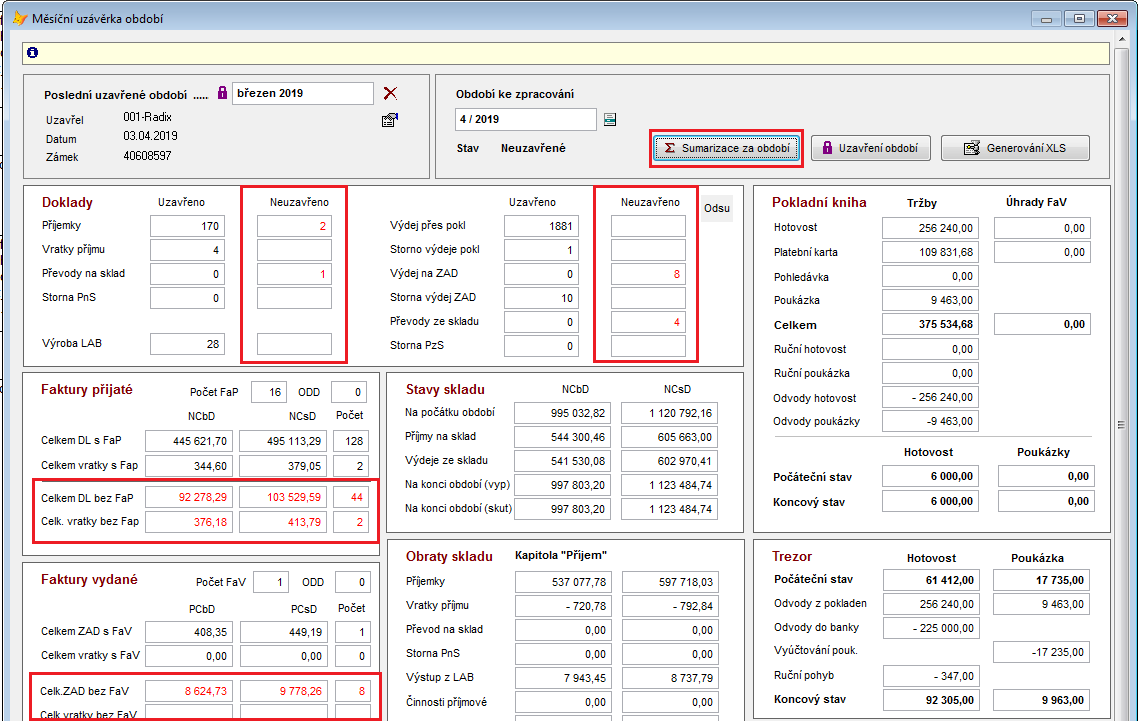 Kontrola se provádí mezi protokolem uzávěrky (karta Sumarizace) za předchozí období a sumárními čísly zobrazenými v dialogu Měsíční uzávěrka období.