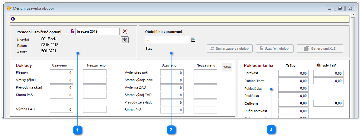 Oblast s informací o aktuálně zpracovávaném - uzavíraném období + tlačítka pro provedení jednotlivých úkonů