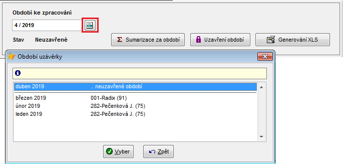 Výběr období ke zpracování Aby bylo možné provádět úkony spojené s měsiční uzávěrkou, je třeba nejprve vybrat období ke zpracování.