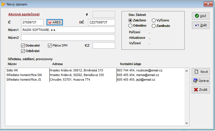 Stav může nabývat následujících hodnot 1/ Pořízeno .. žádost je ve stavu přípravy, nebyla odeslána ke zpracování, předpokládá se její úprava, doplnění, kontrola, apod 2/ Odesláno .. žádost byla odeslána správci centrálních dat k vyřízení, kde je posouzena, zkontrolována 3/ Vyřízeno .. žádost byla vyřízena s výsledkem "obchodní subjekt založen" 4/ Zamítnuto .. žádost byla vyřízena s výsledkem "Zamítnuto", důvodem zamítnutí může být problém s insolvencí, úpadkem společnosti, nebo i existence subjektu v číselníku