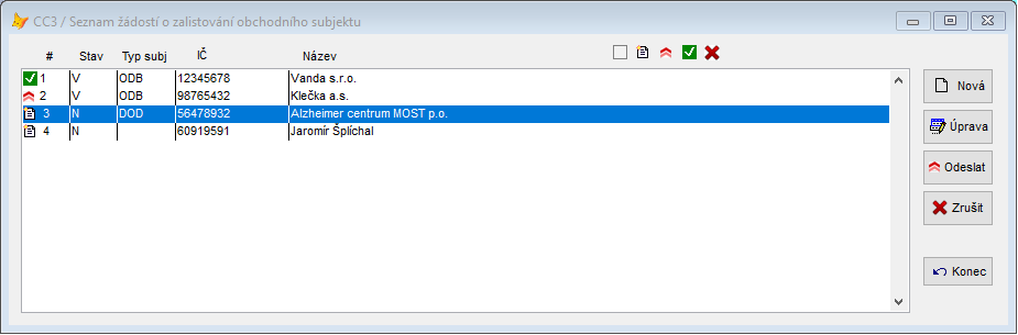 Pokud je třeba zalistovat nového obchodního partnera, pak je třeba vystavit "Žádost o zalistování". Tuto žádost je možné pořídit v agendě číselníků Dodavatelů resp. Odběratelů a ostatních subjektů volba Operace dále volba Žádosti o zalistování odběratele. V dialogu je zobrazen seznam žádostí se základním informacemi pro orientaci včetně informace o stavu vyřízení.