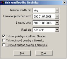 V tabulce vyberete číselníky, mezi kterými potřebujete vytisknou rozdíly a položku, podle které se bude výsledná sestava řadit. V dalším kroku můžete sestavu upravit pomocí generátoru sestav (šířka a pořadí sloupců). Dále lze vytisknout rozdíly mezi skladovými položkami a vybraným číselníkem VZP. Zvolte v menu Nástroje ->Rozdílový číselník VZP-sklad. Zobrazí se dialogové okno ve kterém si zvolíte verzi číselníku se kterým chcete skladové položky porovnat