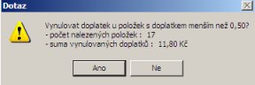 Hromadné nulování doplatků - hromadně, pro vybranou skupinu skladových karet. Příkazem Operace - Hromadné nulování doplatků  V našem příkladě máme v tabulce sedmnáct karet, které mají nový doplatek než 0,50Kč. Provedení operace Hromadné nulování doplatků, se zadáním hodnoty "0,50", hromadně vynulujeme doplatek. Před provedením operace je vám položen kontrolní dotaz, na závěr jste informování o úspěšném provedení operace.