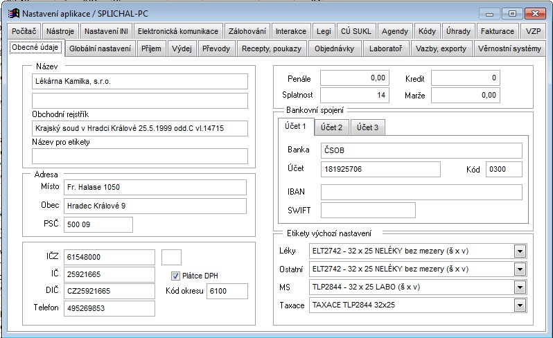 (hlavní menu ČÍSELNÍKY - Nastavení lékárny)