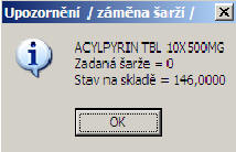Pole pro zadávání vydané položky. Hledat lze podle kódu skladové položky, kódu VZP, APA a PDK kódu, názvu, čárového kódu výrobce a čárového kódu lékárny. Zadáte-li kód zboží, jehož šarže není skladem, program zjistí, zda-li jsou skladem jiné šarže vámi zadané skladové položky. V případě že ano, zobrazí se hlášení, které vás informuje o nulovém stavu zásob příslušné šarže a zároveň o možnostech vybrat jinou šarži. Zadáte-li zboží jehož stav na skladě je nulový, bez možnosti vybrat jinou šarži, nabídne se vám celý číselník skladových karet.
