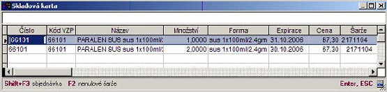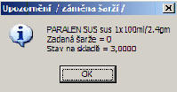Zadáte-li kód zboží, jehož šarže není skladem, program zjistí, zda-li jsou skladem jiné šarže vámi zadané skladové položky. V případě že ano, zobrazí se hlášení, které vás informuje o nulovém stavu zásob příslušné šarže a zároveň o možnostech vybrat jinou šarži. Zadáte-li zboží jehož stav na skladě je nulový, bez možnosti vybrat jinou šarži, nabídne se vám celý číselník skladových karet.