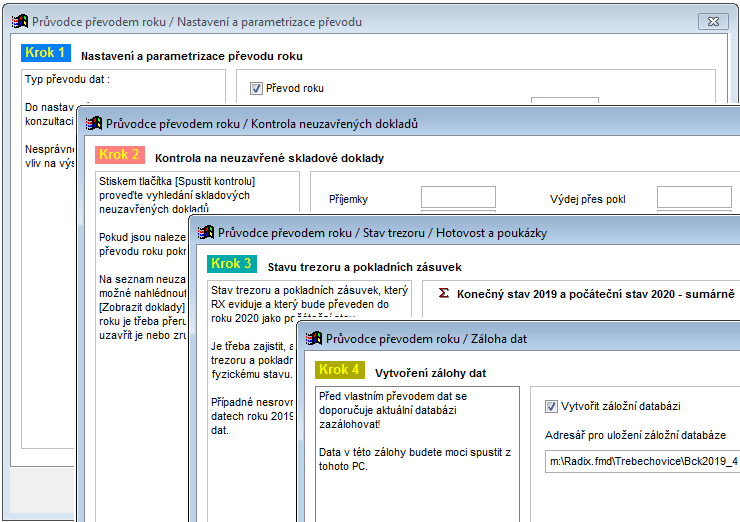 Prostřednictvím Průvodce se provádí jednotlivé kroky (1-9) při převodu roku. Každý jednotlivý krok je indikován v levé horní části, kroky není možné provádět "napřeskáčku", ale pouze ve stanoveném pořadí od 1 do 9.