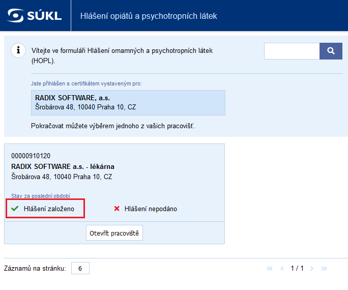 Hlavní formulář HOPL Po založení hlášení z RX by po otevření hlavního formuláře webové aplikace SUKLu měla být zobrazena informace o stavu HOPL v následující podobě. V tiketu konkrétního pracoviště bude indikováno, že hlášení bylo založeno, ale není podáno.